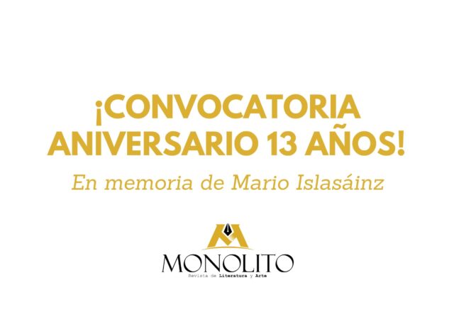 Amigas y amigos, los invitamos a participar en nuestra convocatoria de aniversario por los trece años de vida de Monolito. En esta ocasión, la presente convocatoria es en memoria de nuestro querido amigo, poeta y editor Mario Islasáinz, quien fue parte…