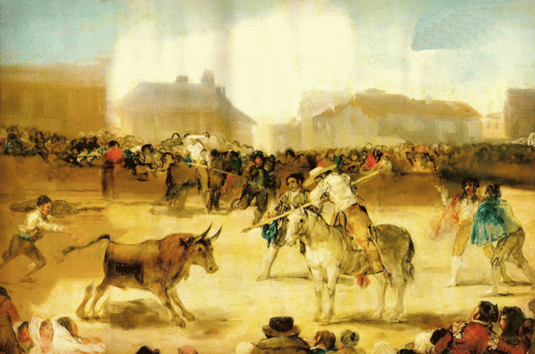 De repente, su mujer que estaba en la tienda, escuchó que un toro se había escapado de la corraleja y en seguida salió a avisarle.