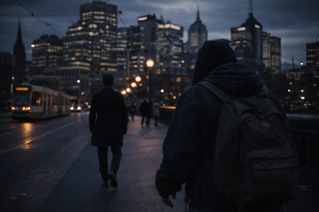 Apenas era cuarto para las seis de la tarde pero en Melbourne parecían ser las diez de la noche. Sobre Collins, una de las avenidas con mayor prosapia de la metrópoli, los oficinistas caminaban cuesta arriba enfundados en sus abrigos invernales. La mayoría se dirigía a Southern Cross, la estación de tren, y unos cuantos, a la parada más cercana de autobús. El letrero luminoso de un banco bañaba de amarillo los cuerpos de los transeúntes que uno tras otro desfilaban frente a la sucursal. Con el rostro oculto bajo el percudido gorro de un hoodie, un vagabundo entrado en años, clavó su mirada sobre una rubia que cruzaba por el paso de zebra mientras se escuchaba el peculiar pitido para auxiliar a los ciegos; el viejo ladeó la cabeza, esbozó una mueca de complacencia y bebió un buen sorbo de leche sabor fresa directamente de una botella de plástico.