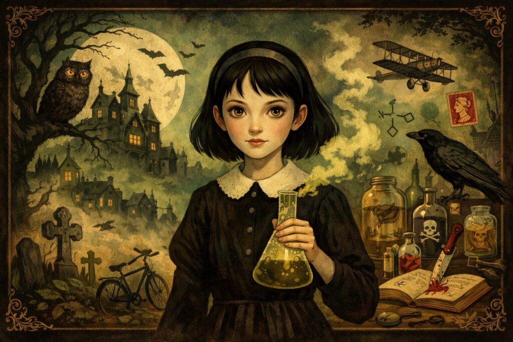 Desde las primeras páginas, Flavia se presenta como una niña distinta. Tiene once años, vive en la vieja mansión de Buckshaw y siente una fascinación poco común por la química, en especial por los venenos. Un extraño talento que podría resultar inquietante en otro contexto se convierte en el motor de la historia y en la clave para resolver el misterio central del libro. Lo interesante es que el autor Bradley no utiliza este rasgo solo para avanzar la trama, sino para cuestionar la idea de lo que se considera “normal” o aceptable, especialmente en una niña.