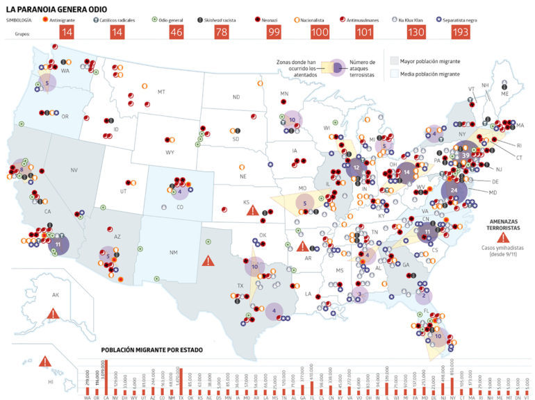 Pero entramos en otra cuestión. Los medios de comunicación nos muestran el resurgimiento del KKK al que la sociedad americana daban por muerta, algo completamente falso y se muestra porque su estructura sigue intacta y sus redes de comunicación les han permitido organizarse sin mayor complicación, mostrándonos que son los blancos los únicos racistas. Si prestamos atención al mapa elaborado por el Centro de Estudios Jurídicos sobre la Pobreza del Suroeste, nos encontramos con otra realidad.
