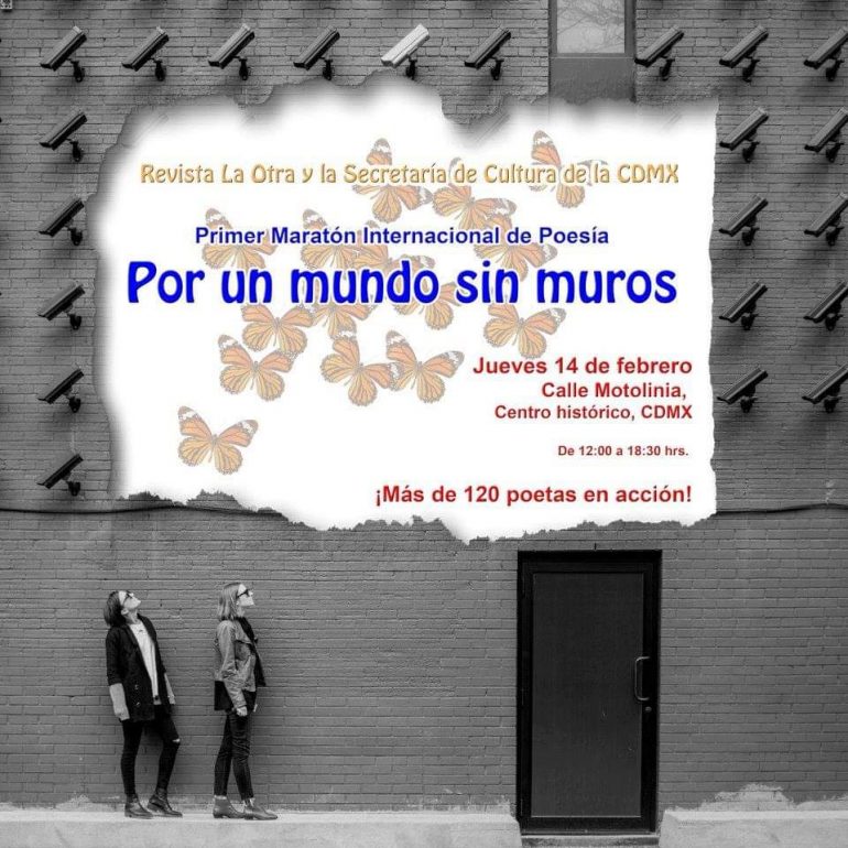Más de 120 poetas mexicanos se darán cita en el Maratón de Poesía “Por un mundo sin muros”, convocados por la Revista de Poesía La Otra (cuyo director es el poeta José Ángel Leyva, y su equipo: las poetas Alina Dadaeva y Leticia Luna), con apoyo logístico de la Secretaría de Cultura de la Ciudad de México; dicho Maratón se llevará a cabo el jueves 14 de febrero, Día del amor y la amistad en México, en el Museo El Rule (donde ocurrirá la inauguración a las 12 del día; y posteriormente, a las 12:30 comenzarán las lecturas de poesía en 5 foros al aire libre que se instalarán a lo largo de la calle Motolinía del Centro Histórico).