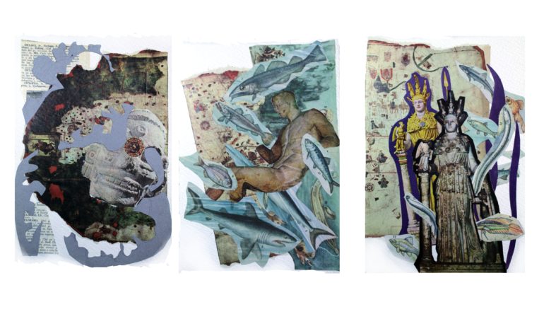 Obra en portada. Odisea. Collage sobre papel, serie sobre la biblioteca perdida (montaje digital) 17 x 23 cm.