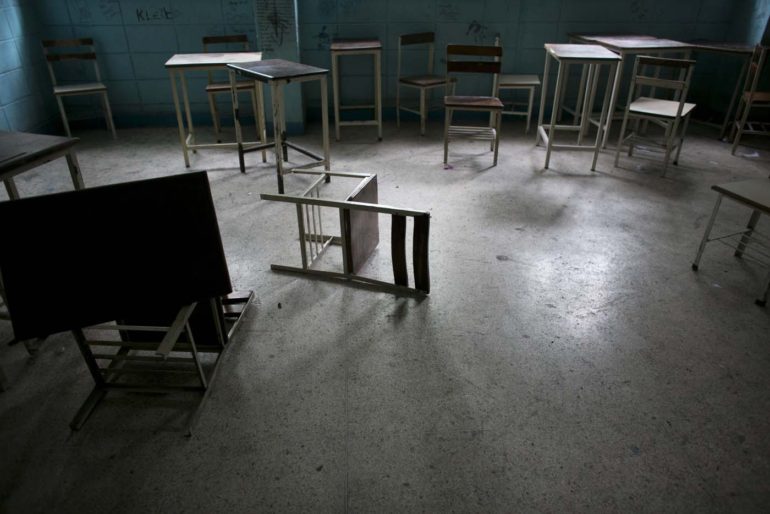 Los niños, las niñas, todos en pelea. Crueles, levantan a uno con lentes, el más débil, entre unos cuantos más atléticos, fanáticos del futbol, que lo tiran y lo patean insaciablemente. Después, la lucha ya es indiscriminada, todos contra todos, motivados por la sangre del primer abatido. Empiezan a tirarse con sillas, a estirarse las colitas las niñas e incrustarse las patas de hierro de las mesas los varones, luchando con lápices, lapiceras puntiagudas, tijeras, compases y borradores.