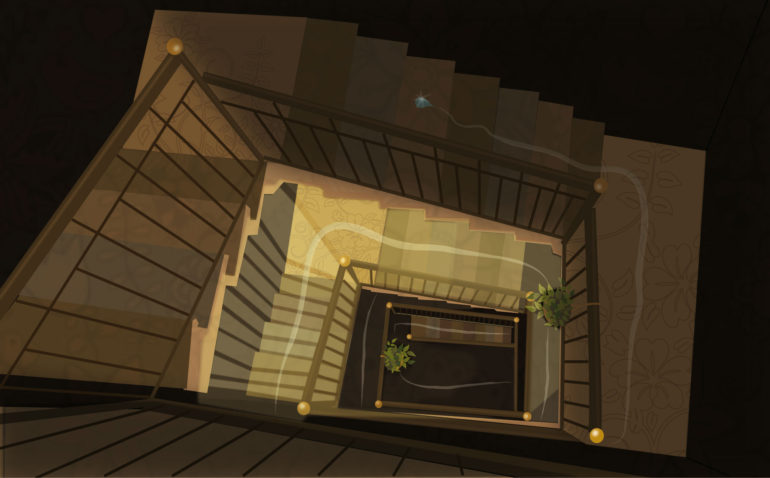 Una gota de agua sube por los peldaños de la escalera. ¿La oyes? Acostado en la cama en la oscuridad, escucho su camino arcano. ¿Cómo lo hace? ¿A brinquitos? Tic, tic, se escucha intermitentemente. Luego la gota se detiene y pienso que quizás por todo el resto de la noche ya no sepa de ella. Pero no, sube. De peldaño en peldaño continúa subiendo, a diferencia de las otras gotas que caen perpendicularmente, de acuerdo con la ley de la gravedad, y finalmente hacen un pequeño chasquido bien conocido en todo el mundo. Ésta no: sube lentamente a lo largo del ojo de la escalera letra E del interminable pedestal. No fuimos nosotros, adultos refinados y sensatos, quienes la señalaron sino una sirvienta del primer piso, una pequeña criatura escuálida e ignorante. Se dio cuenta una noche, ya tarde, cuando todos ya se habían ido a dormir. Después de un rato no pudo contenerse, se levantó de la cama y corrió a despertar a la señora.
